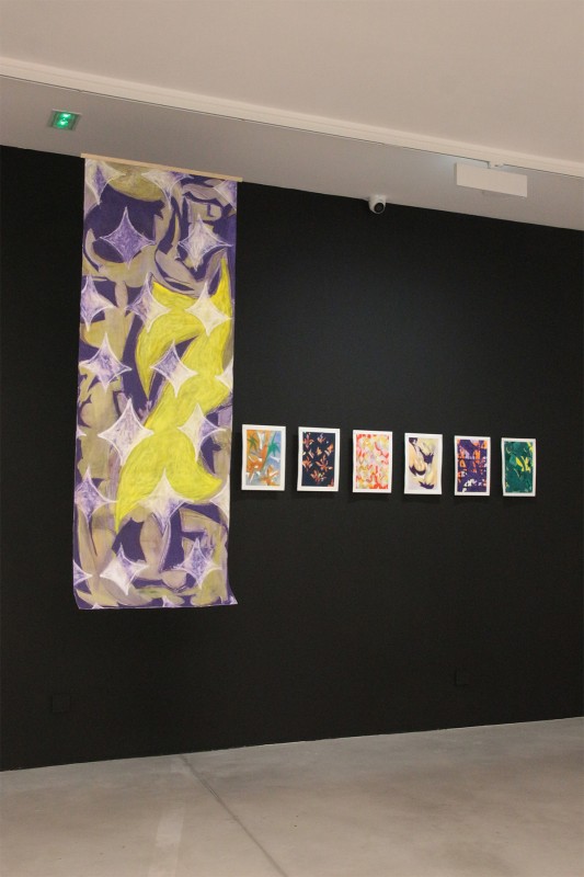 Cette proposition habite l’espace avec des travaux montrés aux murs, au sol et suspendus au plafond par des ls de nylon.
