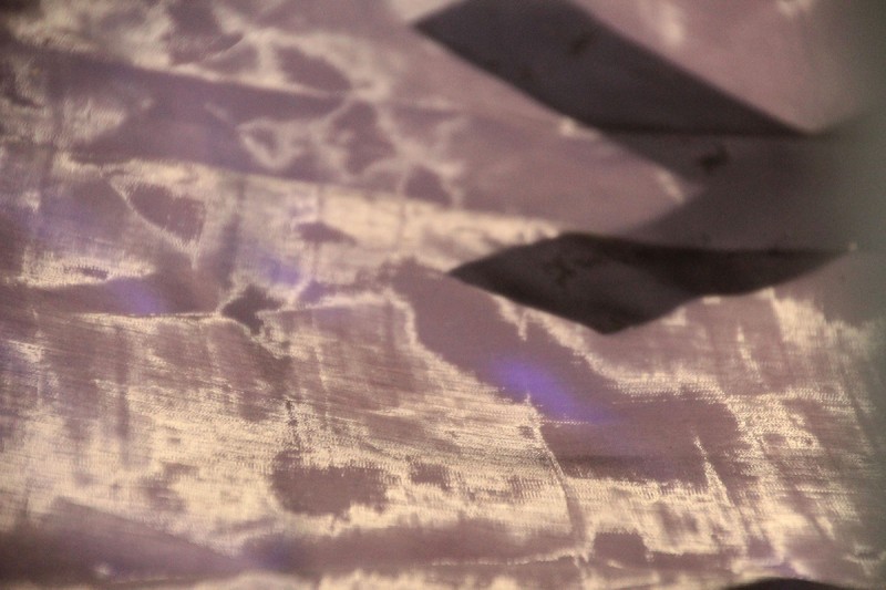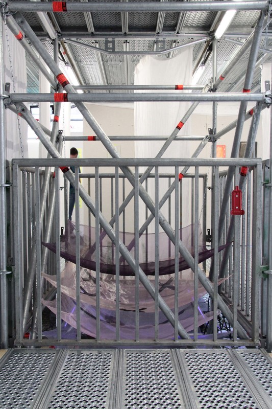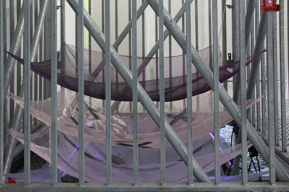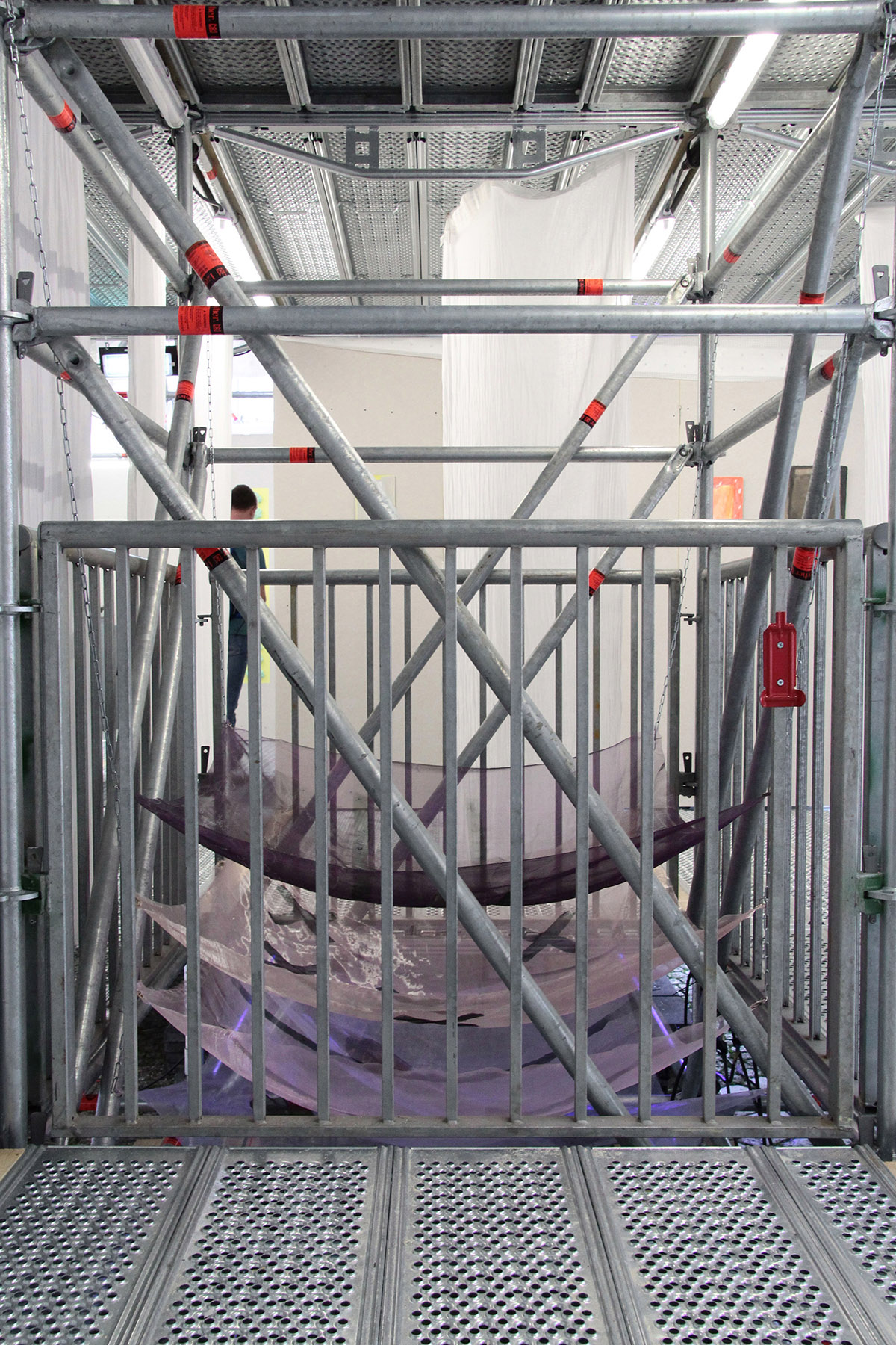 L’œuvre «Layers of artistic breakdown» se présente sous forme de fragiles couches d’organza suspendues par des chaînes métalliques entre les poteaux structurels du bâtiment.