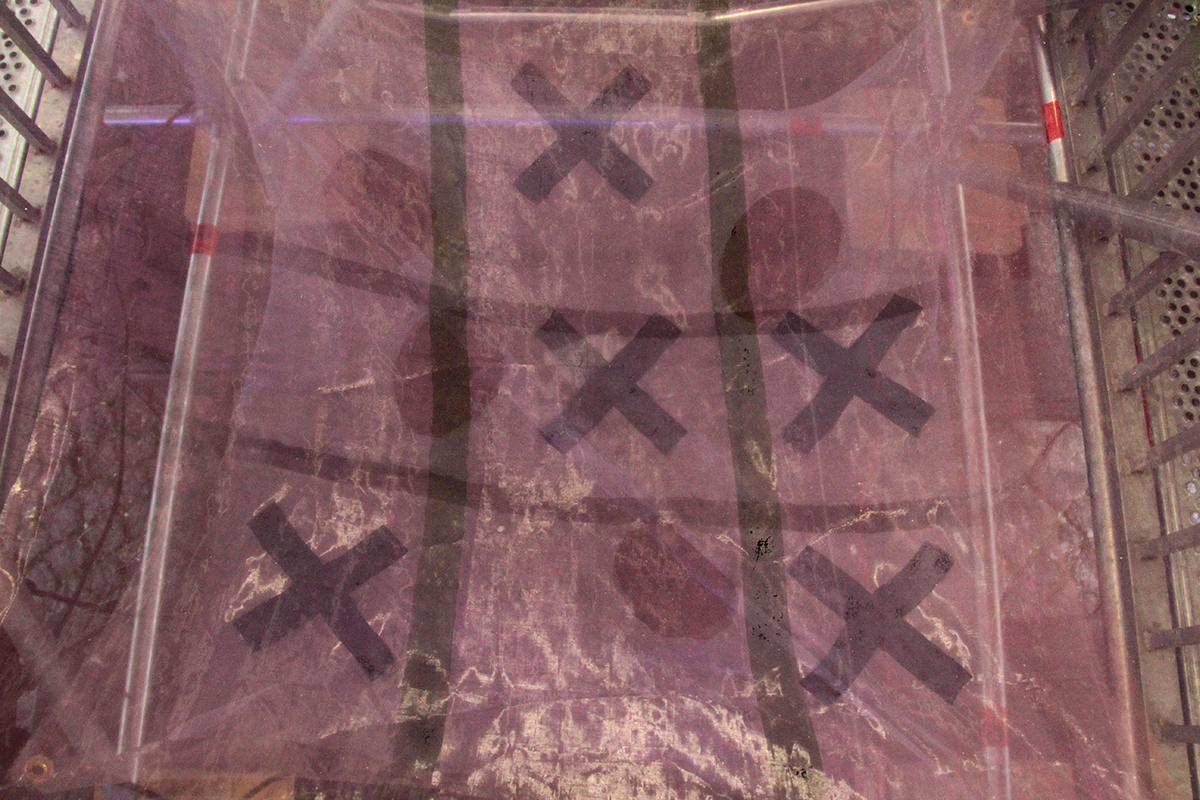 Sur chaque couche de tissu apparaissent en transparence les éléments d’un jeu de morpion dans lequel les deux équipes sot perdantes ; c’est un jeu bloqué, sans issue possible.