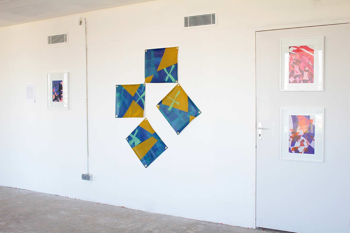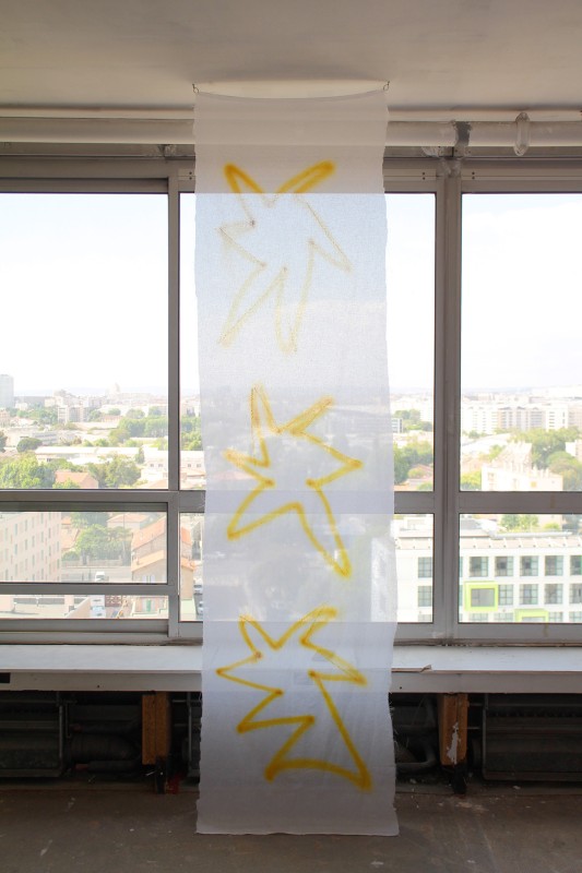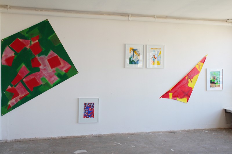 Ludique, aussi vient à l’esprit. Faisant preuve de poésie et d’autodérision, les peintures de Fabiola Amaudric du Chaffaut se détachent du mur traditionnel, prennent du volume pour investir l’espace tout en évoquant des formes populaires issues de l’enfance et deviennent ainsi damiers, marelles, morpions, cerfs-volants. Cerfs-volants qui se veulent aussi drapeaux, manifestes de la liberté de l’artiste dans ses expérimentations qui n’ont pas vocation à entrer dans la norme.