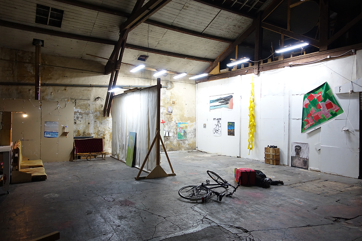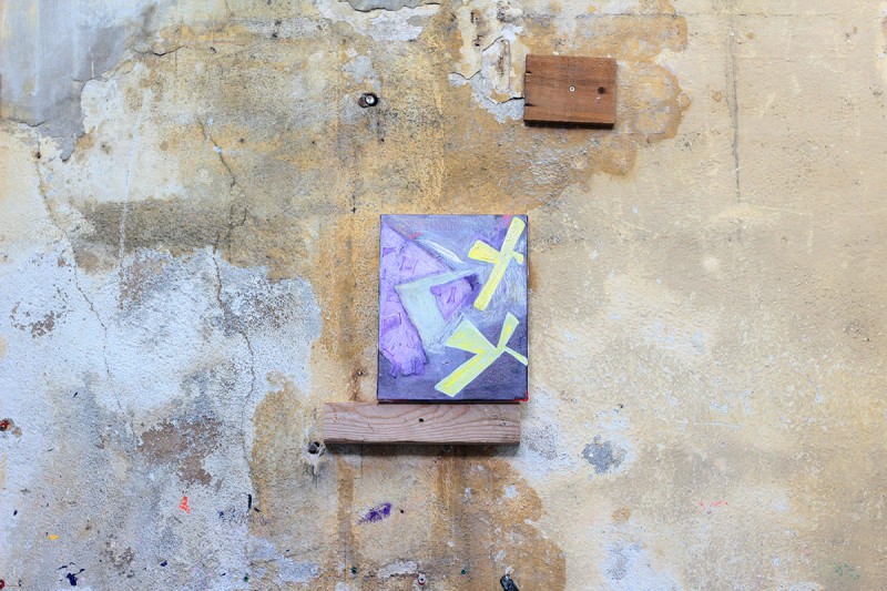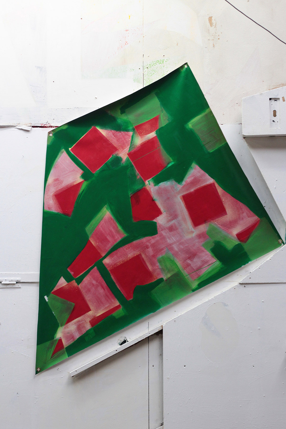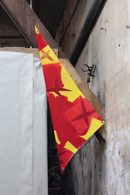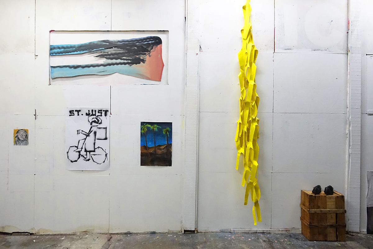 Le côté bouillonnant, hybride et survolté de la ville se traduit par des propositions allant du délicat dessin au pastel sur papier à l’installation monumentale de tissu peint suspendu aux poutres de la charpente de l’espace d’exposition.