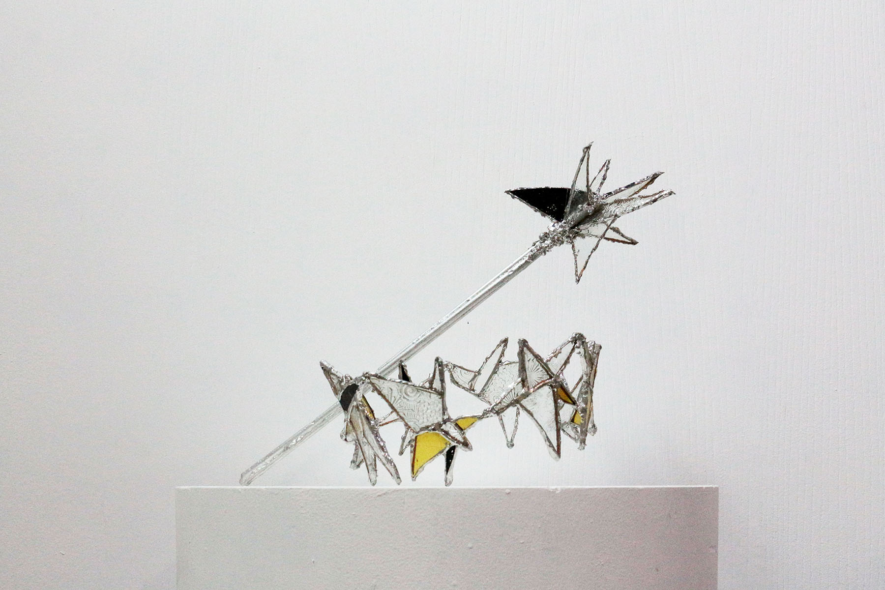 Couronne réalisée à partir de huit étoiles en verre soudé à l'étain. Sceptre réalisé en fonte d'aluminium, verre soudé et étain. Couronne 22 x 8 cm Sceptre 35 x 5 cm